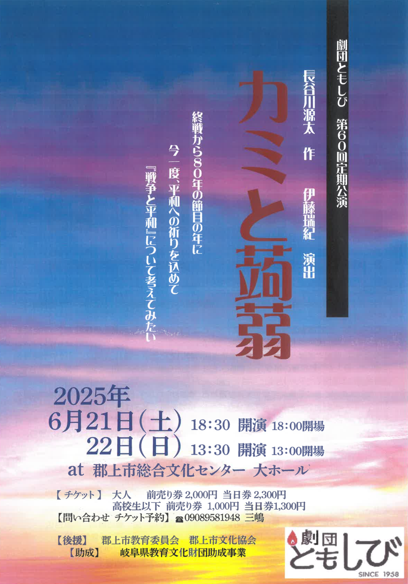 本当に二度と戦争などしてはいけないと、登場人物の心情がうったえられてきました。若い方の演出もとてもすばらしく心に響いてきました。これからも頑張って下さい。 郡上の歴史にちなんだ作品