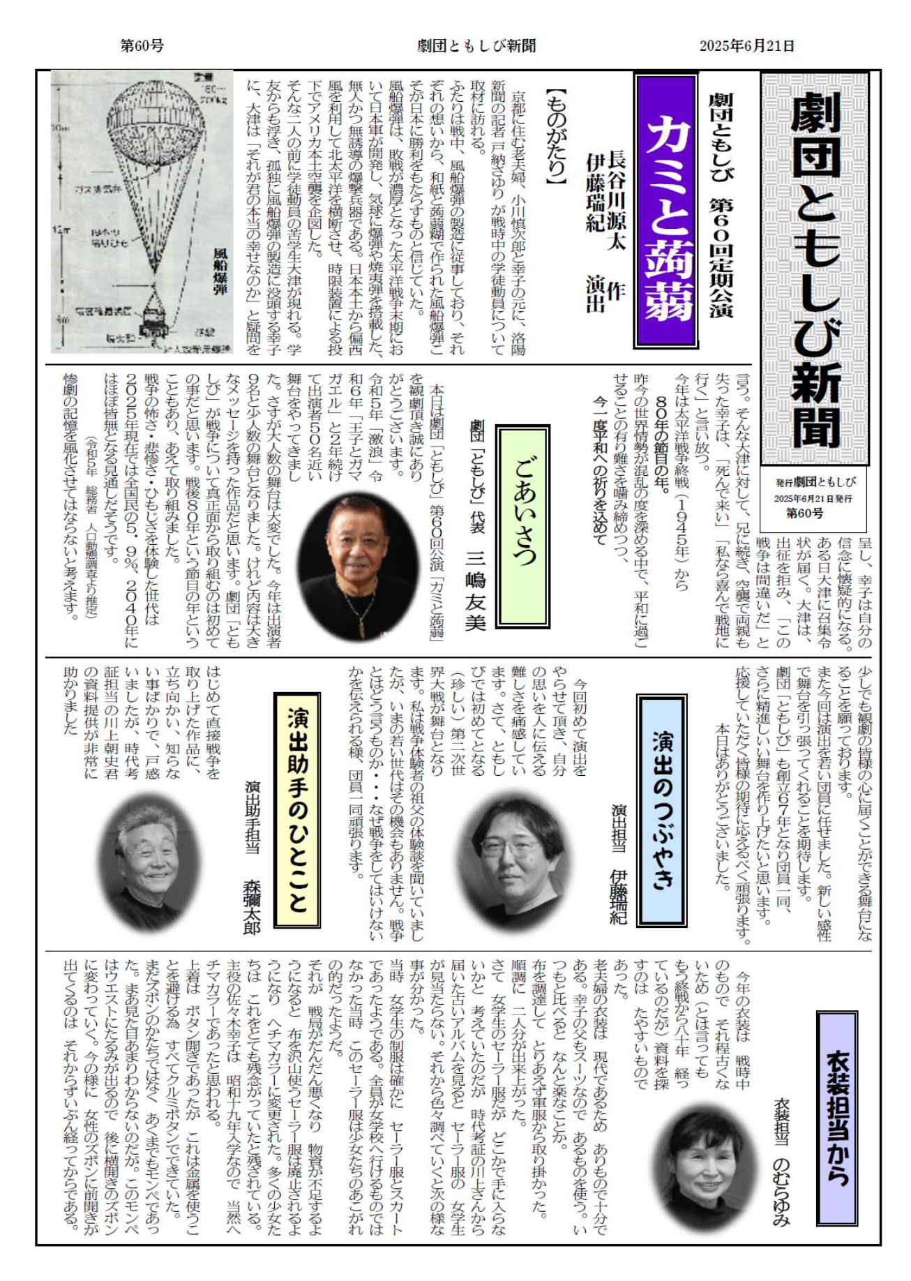 昨年9月ごろ、美濃市で今回の様な和紙と蒟蒻糊で作られた風船爆弾の絵本の朗読会が開かれたNHKのニュースを見聞きしていたので、今回公演の題材として取り上げる事がとても重要で、薄れがちな戦争の知られざる記憶を後世にしっかり語り伝え、二度と戦争をしない平和な日本をつなげていく意味で大切だと思います。演者の方だけでなく劇団にかかわる皆さんがその思いをもって今回の公演を作り上げている姿がよく分かった素晴らしいと思います。戦後80年、ともしびの公演も大60回と記念すべき節目となり、身近にある生活の道具が素材が戦争の兵器に容易に転用されてしまう恐ろしさを痛感しました。時代の物言えぬ状況があり、暴力も飛び交うので思っても言えないし、全く恐ろしさ、違和感に気付きにくいのかも知れません。大津が小川に「幸子さんにどうしても手紙を渡してほしい」という執念と、小川の後悔と言うのが思い返して浮かぶ苦悩する姿が最後の展開でとても良かったです。しっかり今回のメッセージ性が表せていたと思います。素晴らしい公演、作品を見せて頂き誠にありがとうございました。 古代ギリシャ、ローマ的なもの、ホームコメディ