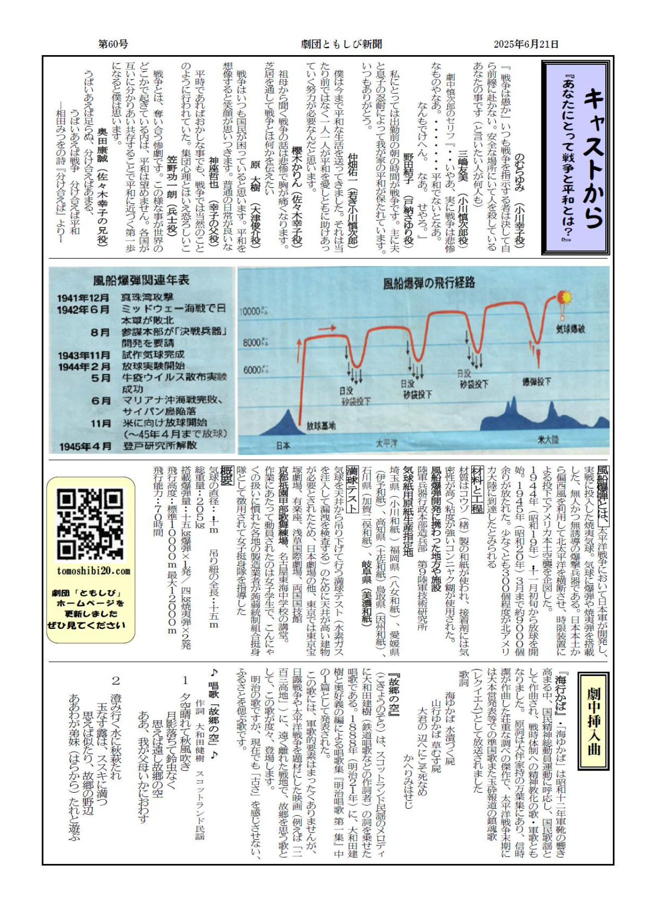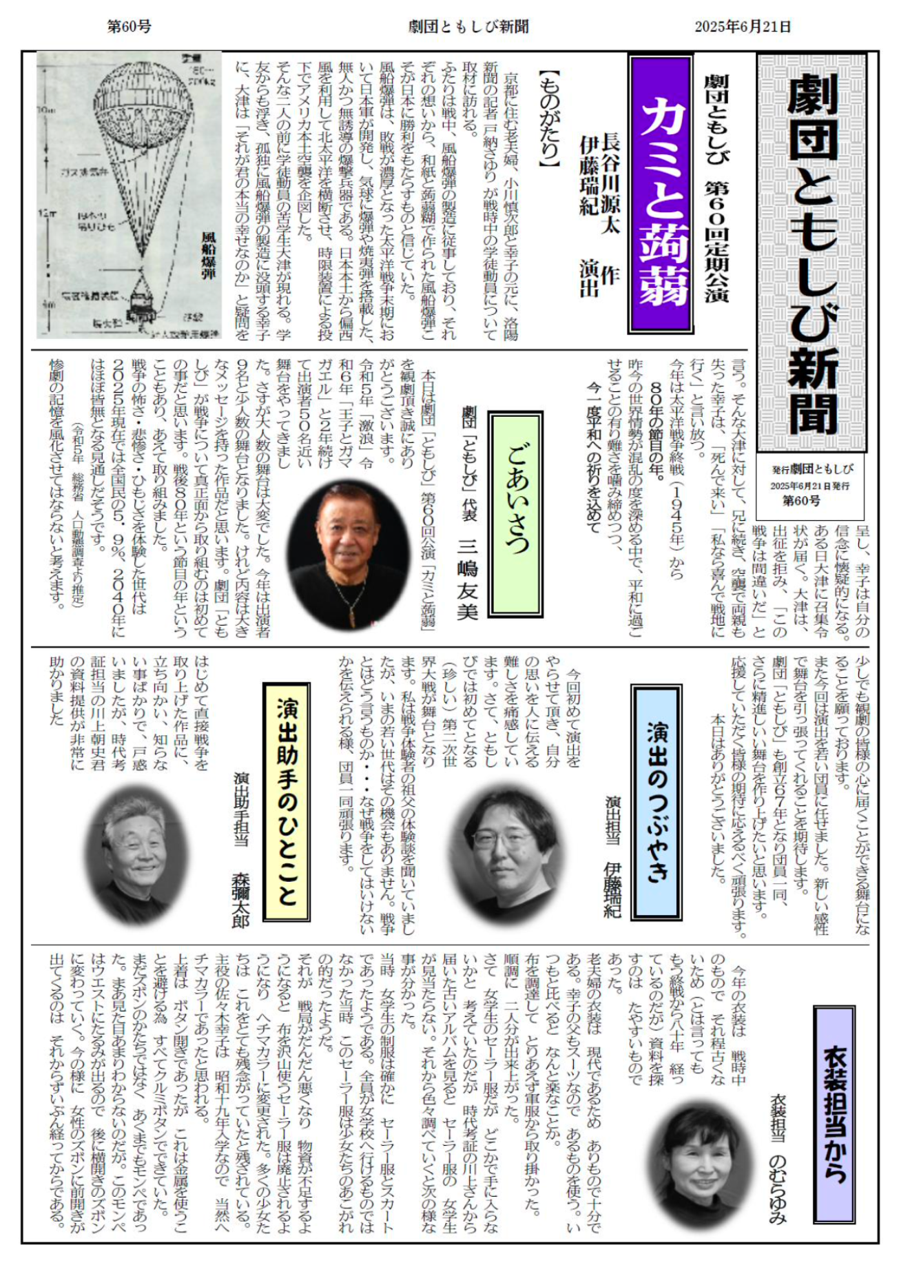 昨年9月ごろ、美濃市で今回の様な和紙と蒟蒻糊で作られた風船爆弾の絵本の朗読会が開かれたNHKのニュースを見聞きしていたので、今回公演の題材として取り上げる事がとても重要で、薄れがちな戦争の知られざる記憶を後世にしっかり語り伝え、二度と戦争をしない平和な日本をつなげていく意味で大切だと思います。演者の方だけでなく劇団にかかわる皆さんがその思いをもって今回の公演を作り上げている姿がよく分かった素晴らしいと思います。戦後80年、ともしびの公演も大60回と記念すべき節目となり、身近にある生活の道具が素材が戦争の兵器に容易に転用されてしまう恐ろしさを痛感しました。時代の物言えぬ状況があり、暴力も飛び交うので思っても言えないし、全く恐ろしさ、違和感に気付きにくいのかも知れません。大津が小川に「幸子さんにどうしても手紙を渡してほしい」という執念と、小川の後悔と言うのが思い返して浮かぶ苦悩する姿が最後の展開でとても良かったです。しっかり今回のメッセージ性が表せていたと思います。素晴らしい公演、作品を見せて頂き誠にありがとうございました。 古代ギリシャ、ローマ的なもの、ホームコメディ